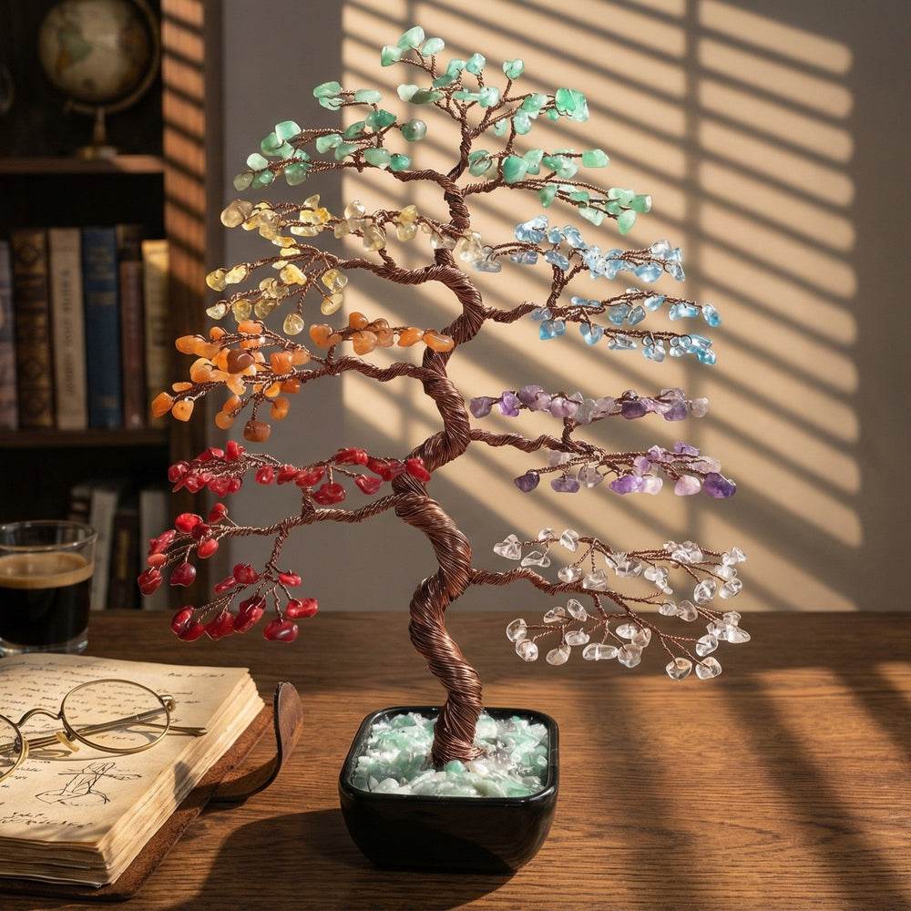 "My desk used to feel so chaotic and gray. Adding this tree shifted the whole energy of the room. I find myself staring at the Amethyst stones when I need a brain break during stressful Zoom calls. It really helps."